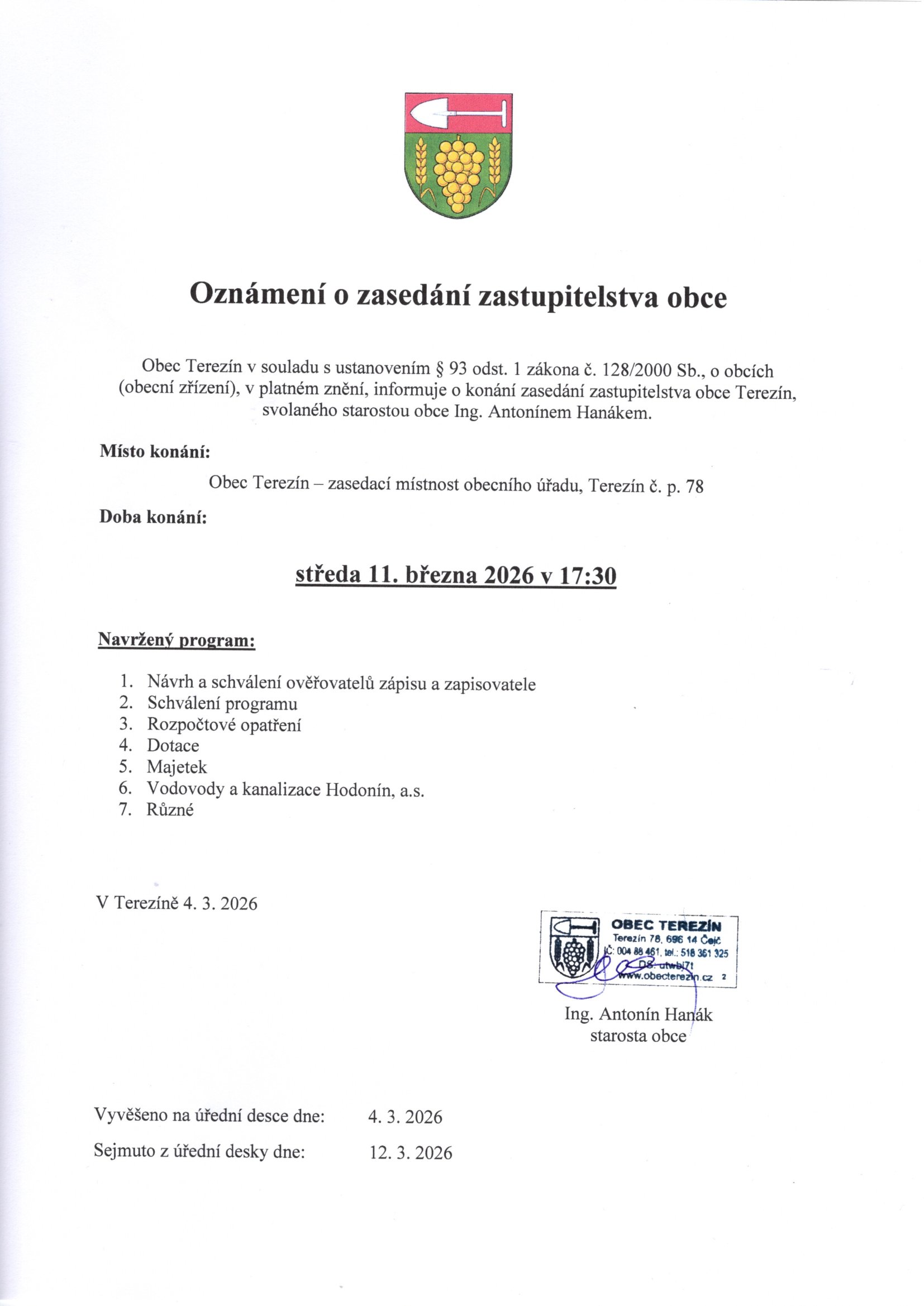 - Oznámení o zasedání zastupitelstva obce Terezín 11. 3. 2026 v 17:30 hodin